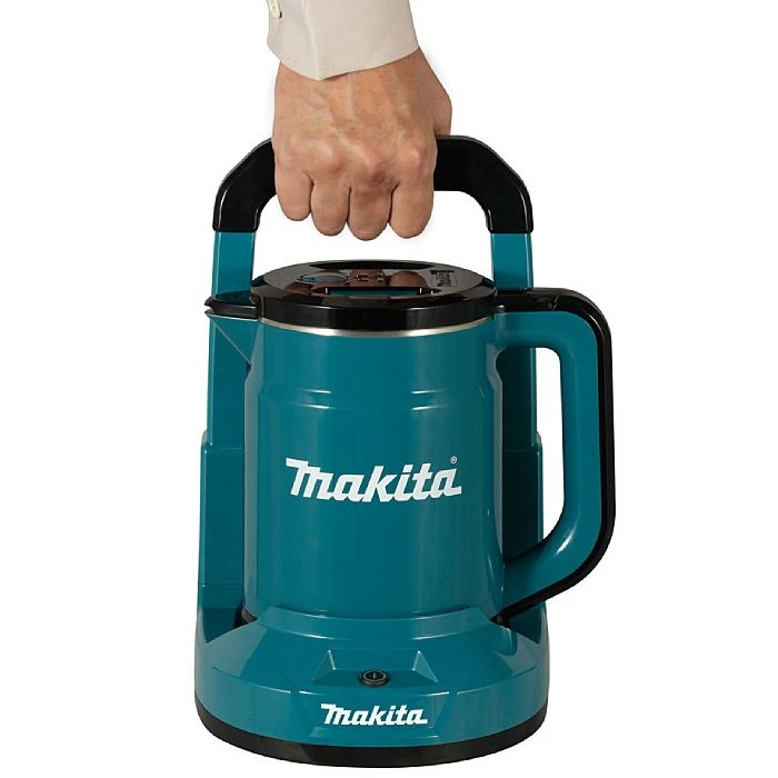This kettle from Makita is part of their 40 Volt XGT system and is capable of boiling almost a litre of water on a single 4.0 Amp-hour battery pack. It can boil a full tank of water (800ml) in under ten minutes. This allows you to have access to boiling water anywhere you want without having to worry about mains electricity or power generation. The construction of the kettle is safe in that the outer plastic shell will only get warm to the touch, and the lid has an anti-spillage lock. Other safety features include the boil-dry protection, and automatic power-off if the kettle or the stand are lifted up. The kettle can operate from either a single battery or two for a longer runtime and more water boiling capacity.