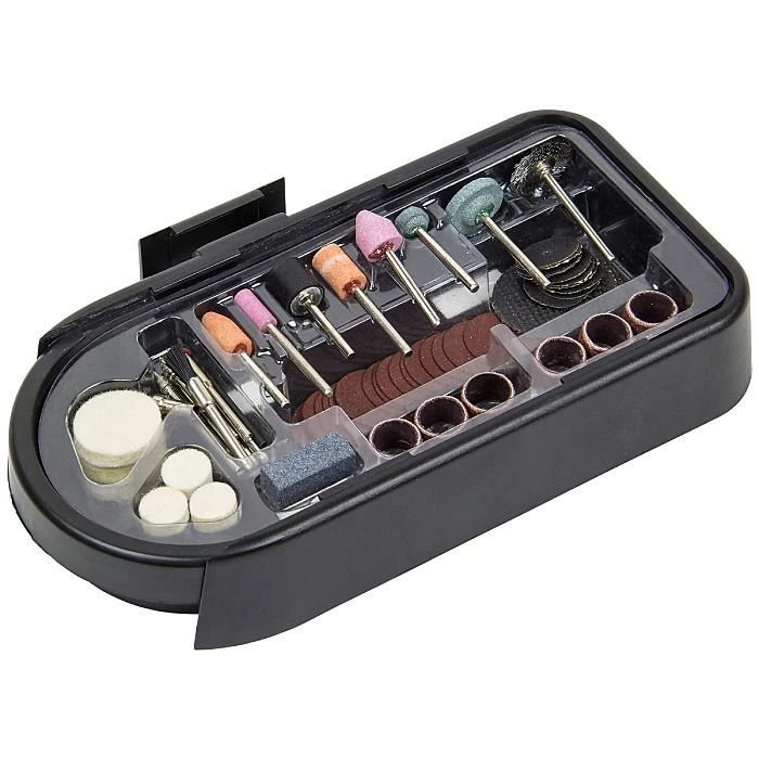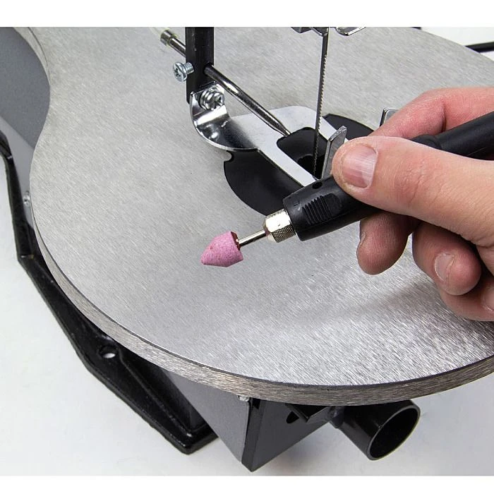 This combination tool from SIP has both a scroll saw and a flexible multi-tool driveshaft. This gives you the ability to attach rotary tool bits such as grinding wheels, sanding accessories, polishing stones and more. A scroll saw is the perfect way to cut shapes out from the centre of a workpiece, as unlike a bandsaw, they use reciprocating motion on a removable straight blade, rather than a long continuous blade. Simply drill a hole in the workpiece, remove the blade from the saw, pass it through the drilled hole, and reattach the blade. While sawing, the integrated bellows blower directs airflow at the cut area, blowing sawdust away for better visibility. Also for visibility is the integrated work light which is on a flexible arm to allow you to get it into the right spot. The saw is powered by a 90 Watt motor, which can have the speed adjusted via a dial on the front, depending on the material and application. The saw can accept either pin-ended blades or pin-less thanks to the included adaptors. The table of the saw is manufactured from cast aluminium and can be adjusted between 45 degrees and 90 degrees. When cutting hazardous materials such as MDF, you can attach a dust extractor to the port on the front of the machine to reduce exposure. The flexible drive comes with a 64 piece accessory set and works with standard flexi-drive accessories.